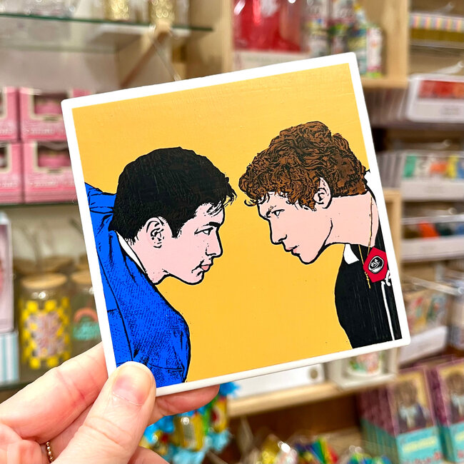 Ceramic coasters sealed with a poly acrylic glaze. Water resistant and heat resistant. Not waterproof, so no dishwasher. Just wipe with a damp cloth to clean. Has a cork backing for extra sturdy support.