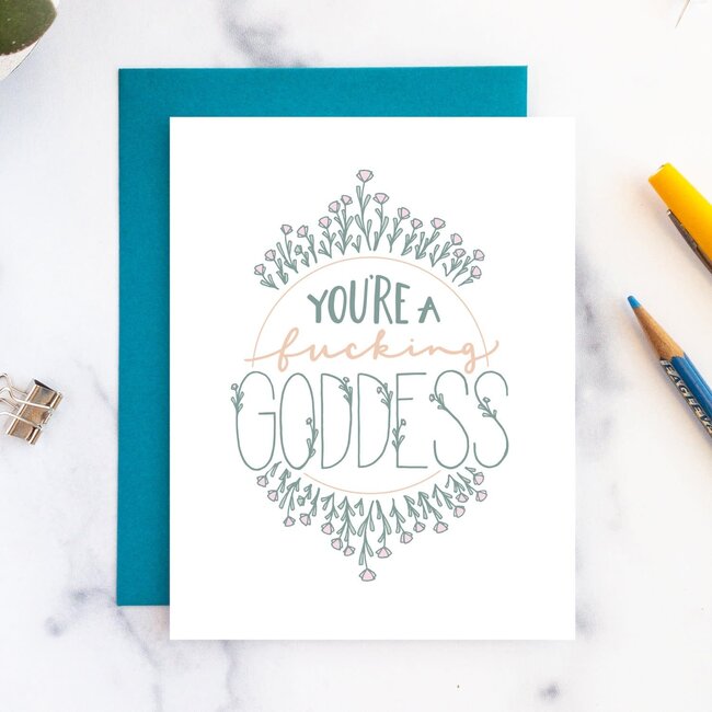 Card description: Hand lettered "You're a fucking goddess" with flower stems.