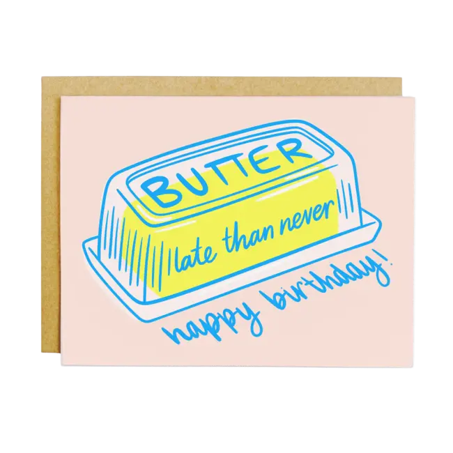 Reads "Butter Late Than Never, Happy Birthday!"