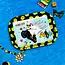this metal tray measures approximately 7" by 5.5" and features a full-color print on the front and gold metal on the back