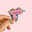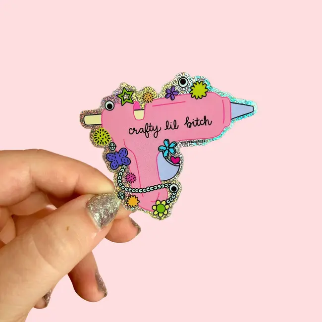 Vinyl water resistant sticker with glossy finish and glitter detail. Measures 2.5 x 2 inches.