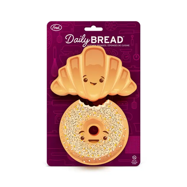 Fred’s Daily Bread sponges are what every kitchen kneads. These crazy-cute kitchen sponges have three hardworking layers to scrub and lock in suds, so crust us, they’ll get the job done. Set of two, packed on an illustrative backer card.