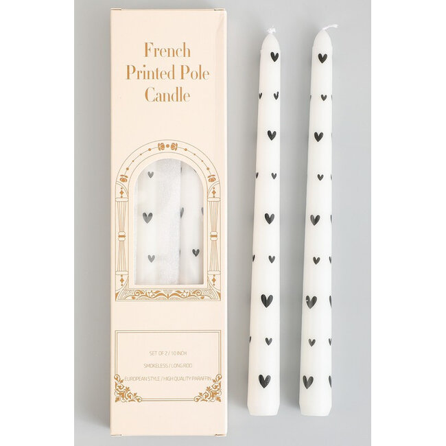 Set the mood with these elegant French Heart Printed Pole Candles. Made from high quality paraffin, these smokeless unscented candles burn cleanly for five to eight hours. Each ten inch candle adds charm and warmth to any space. Set of 2.