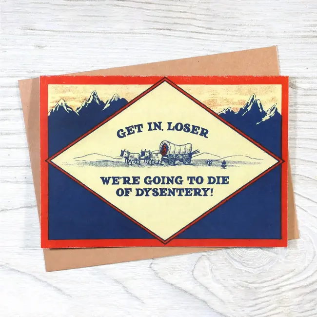 A funny vintage-inspired greeting card that reads "Get In, Loser - We’re Going to Die of Dysentery" Read more.