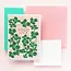 A field of clovers on soft pink with copper foil type, 'Good Luck' message. Blank inside and supplied with a pearl white envelope. Designed and printed in the UK.