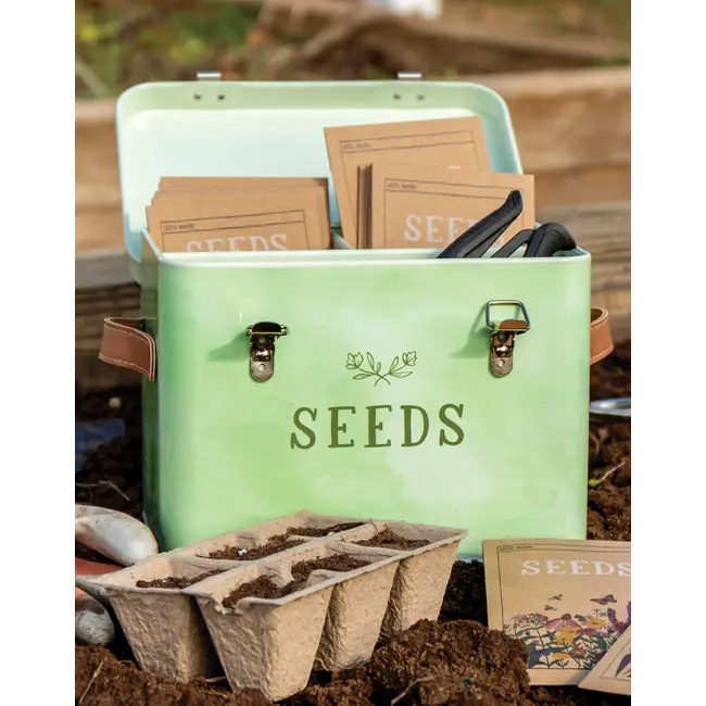 Crafted from durable metal with elegant gold hardware, this tin box features a hinged lid for easy access and a classic metal bookplate on the front for customizable labeling. Inside, divided compartments help separate seed varieties, ensuring effortless organization. The pleather handles add a stylish, functional touch, making it easy to carry wherever your gardening takes you.