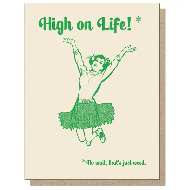 "High on Life* No wait, that's just weed." A2 (5.5x4.25") greeting card, Premium printed on French Paper Co. card stock. Packaged with dank recycled kraft paper envelope.