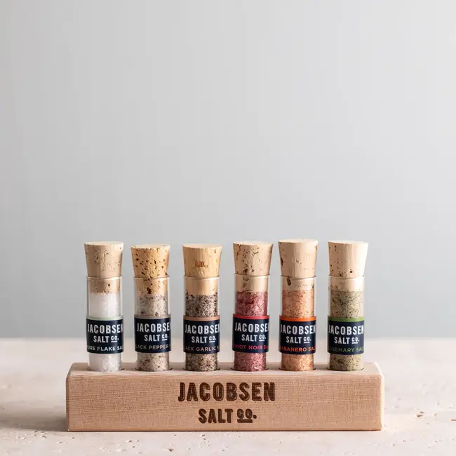 Rosemary Salt, Habanero Salt, Pinot Noir Salt, Black Garlic Salt, Black Pepper Salt, Pure Flake Salt, Wood Stand