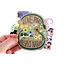 This is a 3.75" x 3" sticker. It is green, pink, blue, yellow, black, peach, brown, and pink printed on kraft paper. It features folky bugs, birds, and flowers.