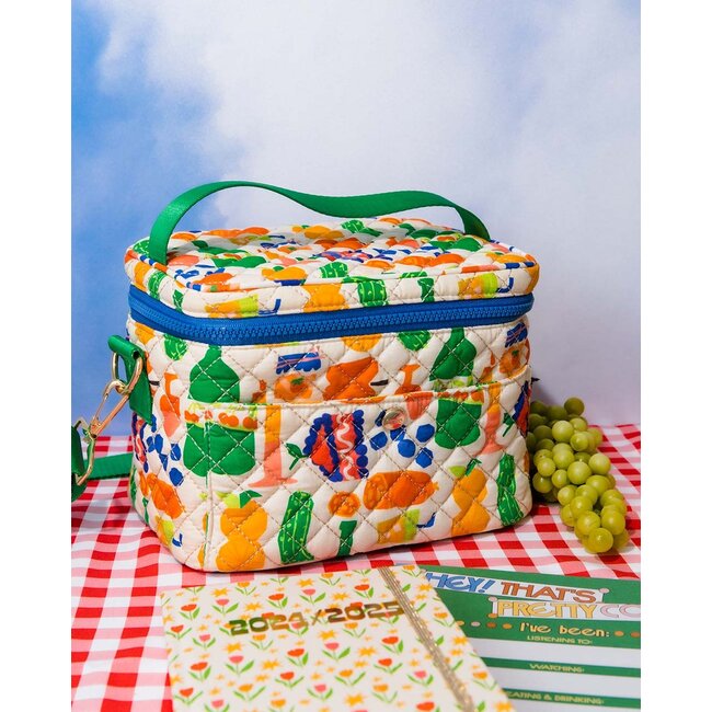 Let's do lunch! This insulated lunch bag has a quilted design, zip closure, and adjustable strap.