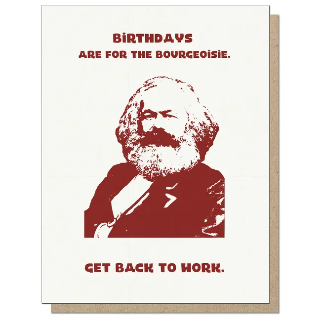 "Birthdays are for the Bourgeoisie. Get Back to Work." A2 (5.5x4.25") greeting card, Premium printed on French Paper Co. card stock. Packaged with recycled kraft paper envelope.