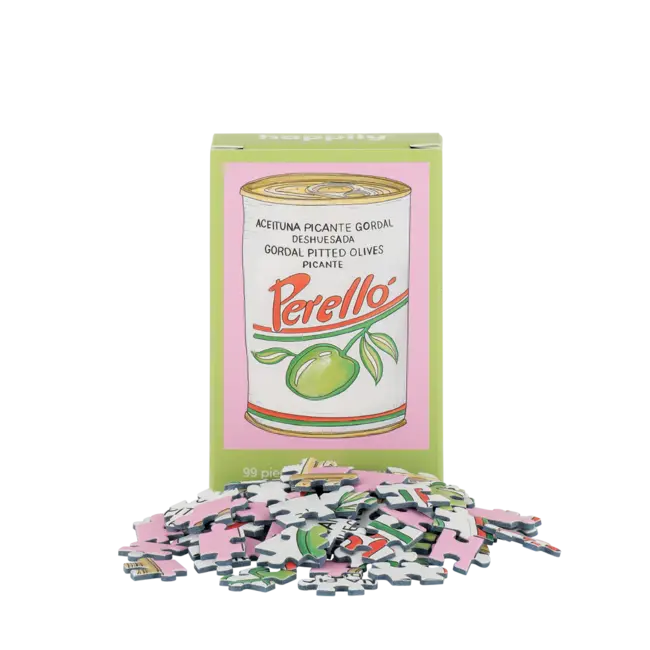 99 Piece Mini Jigsaw Puzzle featuring a fun illustration of can of olives by acclaimed illustrator Natalia Yañez-Stiel. The perfect gift for foodies.