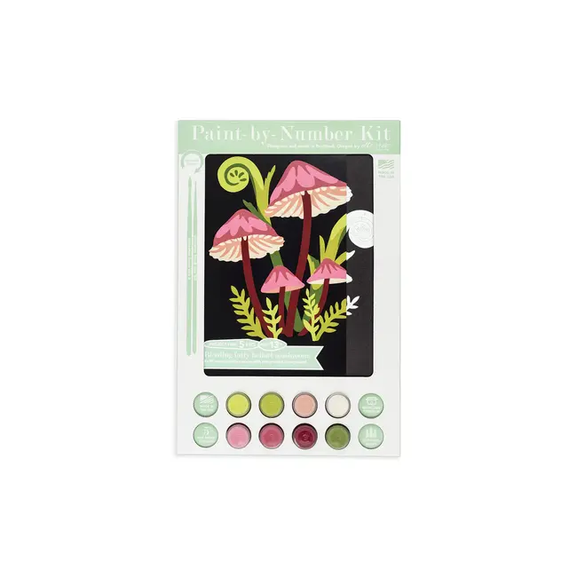 Bleeding Fairy Helmet Mushrooms paint-by-number kit features an encyclopedia plate that showcases berry-capped Bleeding Fairy Helmet mushrooms growing amongst ferns. The preprinted background features the name of the fungi on a rich black background. Read more.