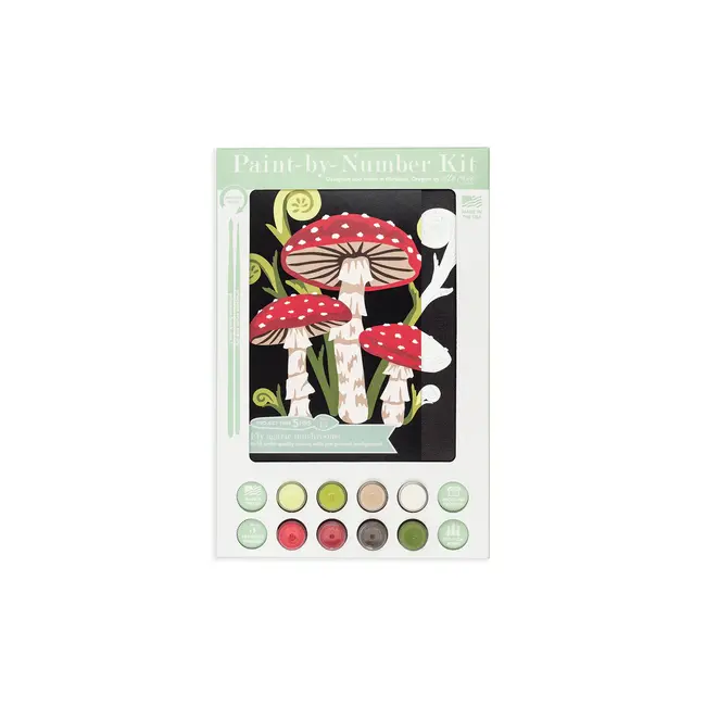 Fly Agaric Mushrooms paint-by-number kit features an encyclopedia plate that showcases these red-dotted frilly Fly Agaric mushrooms. The pre-printed background features the name of the fungi on rich black. Read more.
