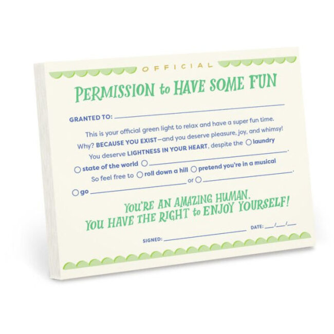 This pad of 50 slips encourages people to lighten up and enjoy themselves—in a super fun, semi-official-ish way. They're great for sticking on fridges, mirrors, bulletin boards… wherever lols and actual inspiration are needed! Read more.