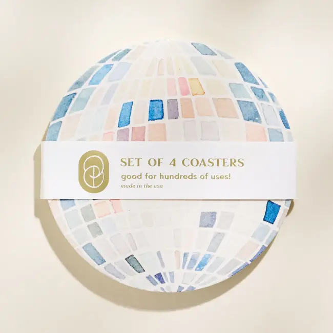 Set of four chipboard coasters, measuring 3.7 inches.