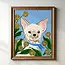 This 8 x 10 art print features a chihuahua peeking from behind billy button flowers. It is an original illustration by independent female artist and business owner, Tara Reed, who hopes her art brings you a bit of joy.