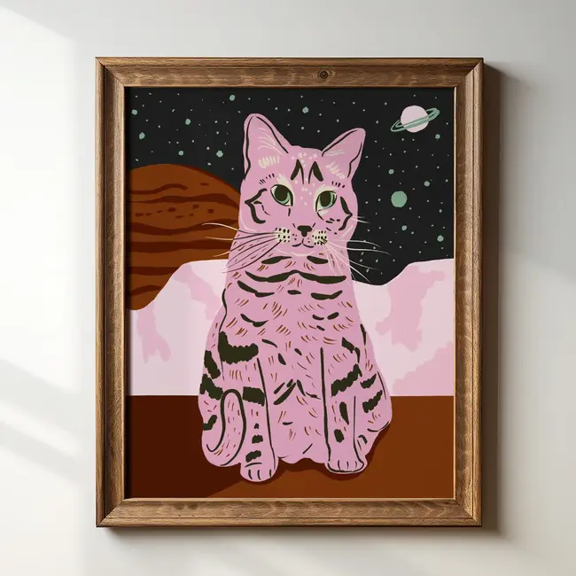 This is an 8 x 10 art print of a pink cat in space. It is an original illustration by independent female artist and business owner, Tara Reed, who hopes her art brings you a bit of joy.