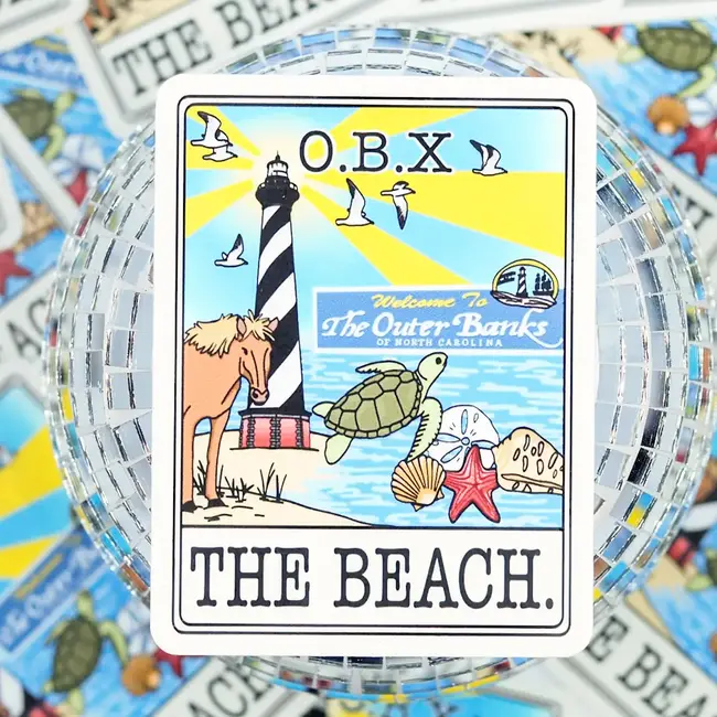 This colorful O.B.X. “THE BEACH" sticker brings the Outer Banks to life with hand-drawn icons including wild horses, sea turtles, lighthouses, and seashells. A playful tribute to North Carolina’s most iconic coastline