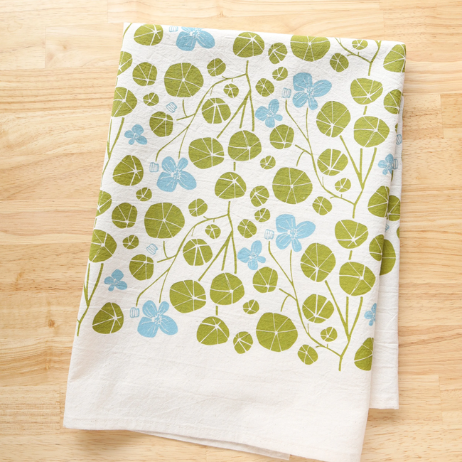 Each towel is printed by hand in our Asheville, North Carolina studio, beginning as an original illustration inspired by nature and simple daily rituals. We use eco-friendly, water-based inks that are non-toxic and permanent, creating long-lasting designs with subtle variations that celebrate the handmade process.