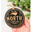 Custom designed hometown leather ornament. The design is engraved directly into the leather. Approximately 3.75” in diameter. It is lightweight, can be used as a gift tag, ornament or promotional gift.